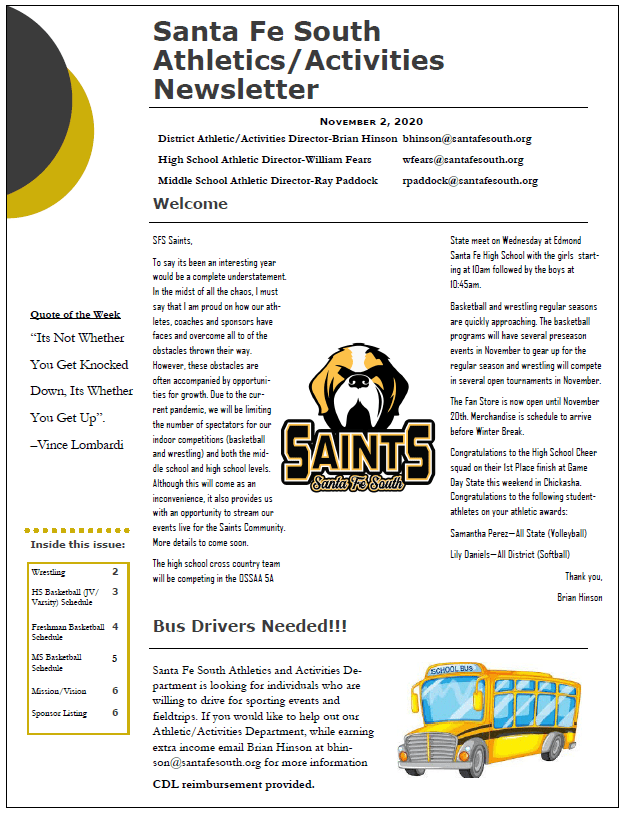 SANTA FE SOUTH Athletic Department Newsletter (November 2nd) Posted byPathwaysNovember 2, 2020Posted inNEWS AND EVENTS Share this: Click to share on X (Opens in new window) X Click to share on Facebook (Opens in new window) Facebook Click to email a link to a friend (Opens in new window) Email Like Loading...